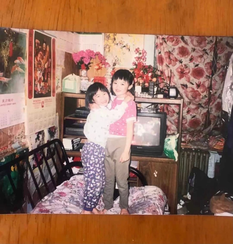 I came across this picture today while talking to my sister, and it sent me back 25 years for a brief moment. I took in all the details of the background – calendar paper used as wallpaper, video cassettes of TVB episodes, my sister and I in hand-me-down clothes, standing in the living room that also doubled as a bedroom for my two uncles.